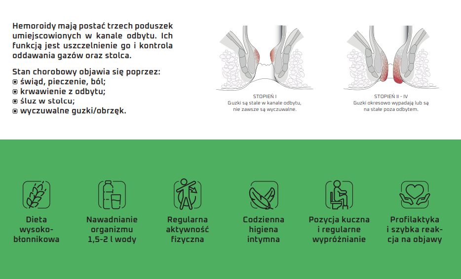 regularne wypróżnianie i unikanie nadmiernego parcia (pomaga „pozycja kuczna” – np. mały stołeczek pod stopy).