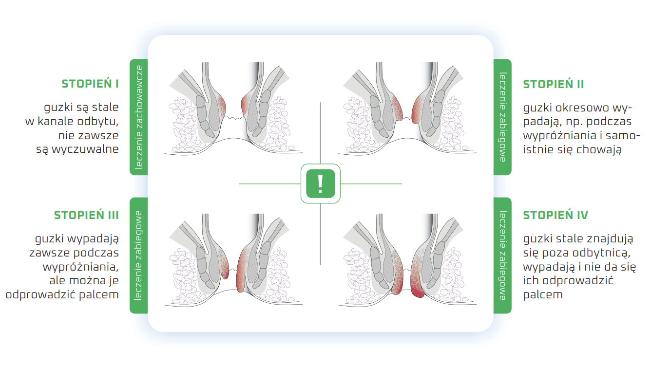 Hemoroidy dzieli się na stopnie I–IV:
